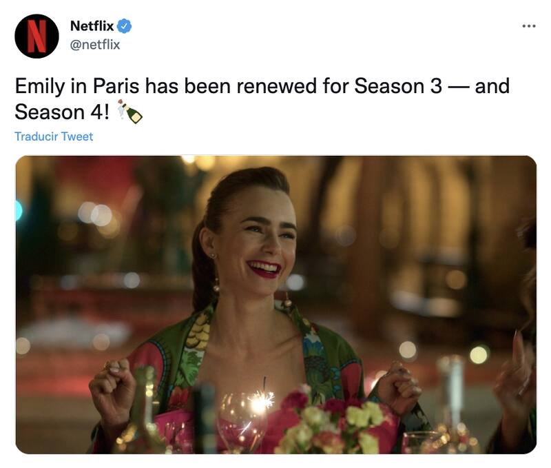 La serie de Netflix, una comedia que nos cuenta la vida de Emily, a quien no le sale nada como lo tiene planeado, ni en su trabajo ni en el amor ni en la vida en general, tendrá dos temporadas más, renovación que fue anunciada por la plataforma hace un tiempo junto a una foto sonriente de Lily Collins, actriz que interpreta a Emily.