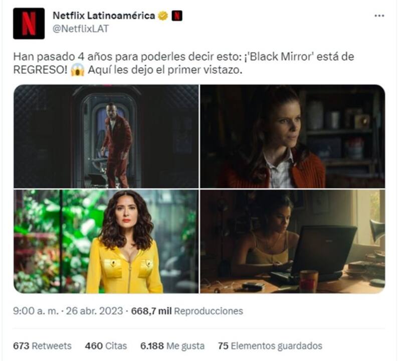 Una de las series más representativas de la plataforma de Streaming, Netflix sin duda es "Black Mirror” y este miércoles 26 de abril confirmó la fecha de su estreno, juntó a una gran noticia pues Salma Hayek se unió al elenco principal.