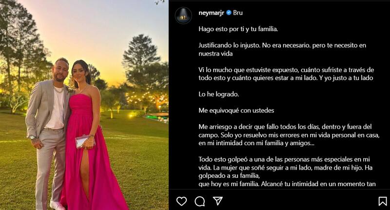 “Todo esto afectó a una de las personas más especiales de mi vida. La mujer que soñaba seguir a mi lado, la madre de mi hijo. Llegó a su familia, que ahora es mi familia. Alcanzó su intimidad en un momento tan especial que es la maternidad. Bru, ya me disculpé por mis errores, por la exposición innecesaria, pero me siento obligado a reafirmarlo públicamente”, agregó el futbolista brasileño.