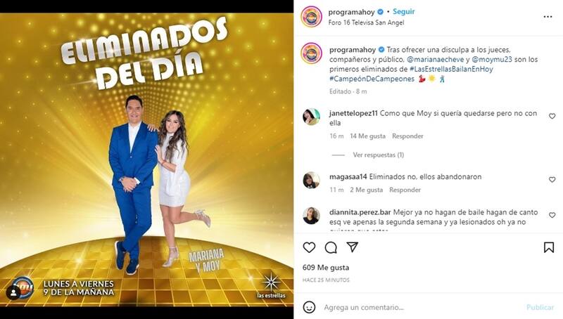 Esta mañana Moisés Muñoz y Mariana Echeverria se presentaron en el programa "Hoy", en el reality, "Las estrellas bailan en hoy": Campeón de campeones" para agradecer el apoyo de todos sus fans y abandonar la competencia, luego de que sus compromisos personales y laborales no se los permitiera.