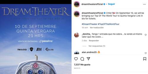 Pero ahora, Dream Theater llevará hasta Chile su Top of the World Tour, que recibe su nombre del álbum más reciente, creado durante la pandemia. El concierto será en el Quinta Vergara en Viña del Mar este 10 de septiembre (entradas a través del sistema Passline). "Nuestros shows siempre han sido increíbles en Chile", dice, y agrega: "Hemos establecido una increíble relación con nuestros fans chilenos desde la primera vez que vinimos allí en 2005. Estamos emocionados".