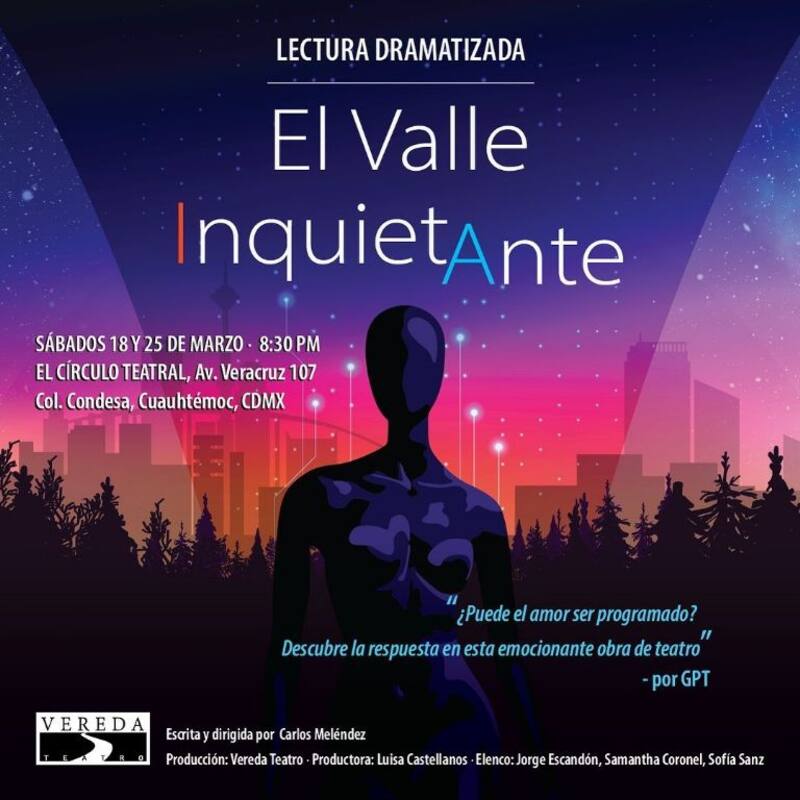 "El Valle Inquitante" es escrita y dirigida por Carlos Meléndez, bajo la producción de Luisa Castellanos. La lectura dramatizada corre a cargo de Jorge Escandón, Samantha Coronel y Sofía Sanz. “La obra esencialmente habla sobre la imperfección del amor y justamente aceptar esos errores para entrar en una relación con una persona y esa tecnología puede ayudarnos o dañarnos”, dijo Carlos Meléndez.