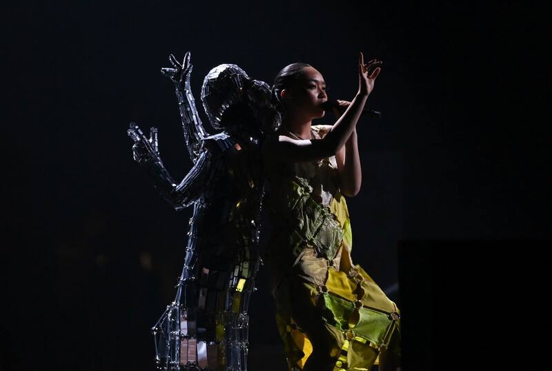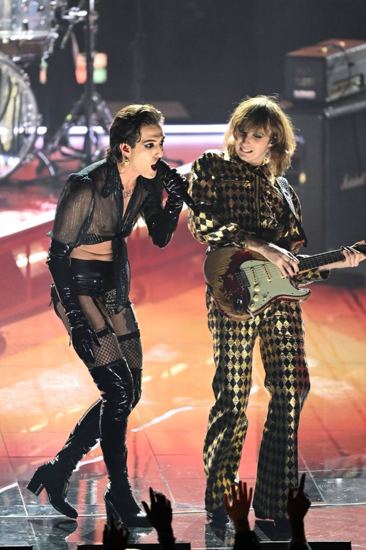 Con un letrero gigante de "MAMMAMIA", Måneskin interpretó su conocido sencillo. La banda de rock italiana se vistió de negro y dorado con el cantante Damiano David luciendo un brillante par de calzoncillos de cuero.