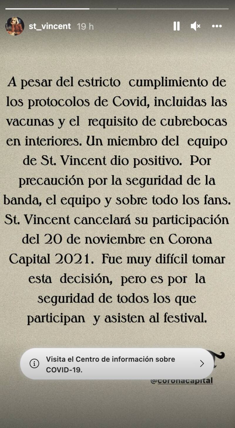 “A pesar del estricto y vigilante cumplimiento de los protocolos de covid, incluidas las vacunas y requisitos del uso de mascarillas, un miembro del equipo de St. Vincent dio positivo, por lo cual se ha decidido cancelar la fecha en el festival mexicano”.
