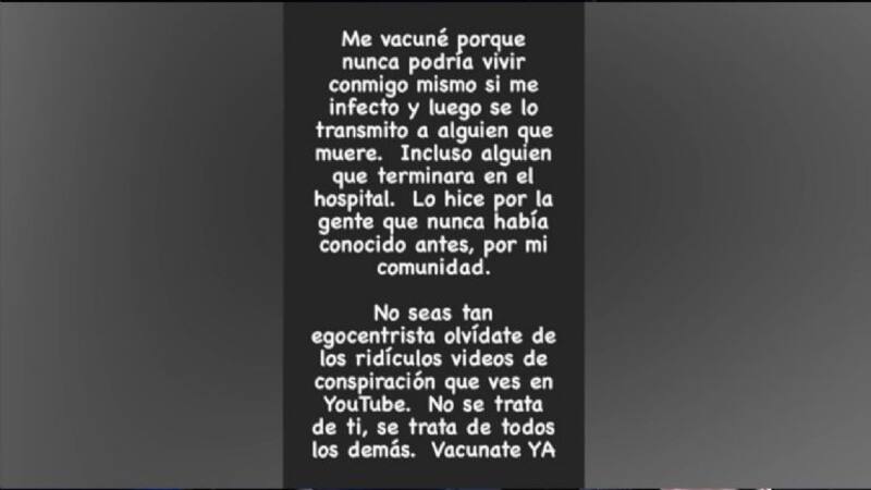 Y continuó: " Lo hice por la gente que nunca había conocido antes, por mi comunidad. No seas tan egocentrista olvídate de los ridículos videos de conspiración que ves en YouTube. No se trata de ti, se trata de todos los demás. Vacunate YA".