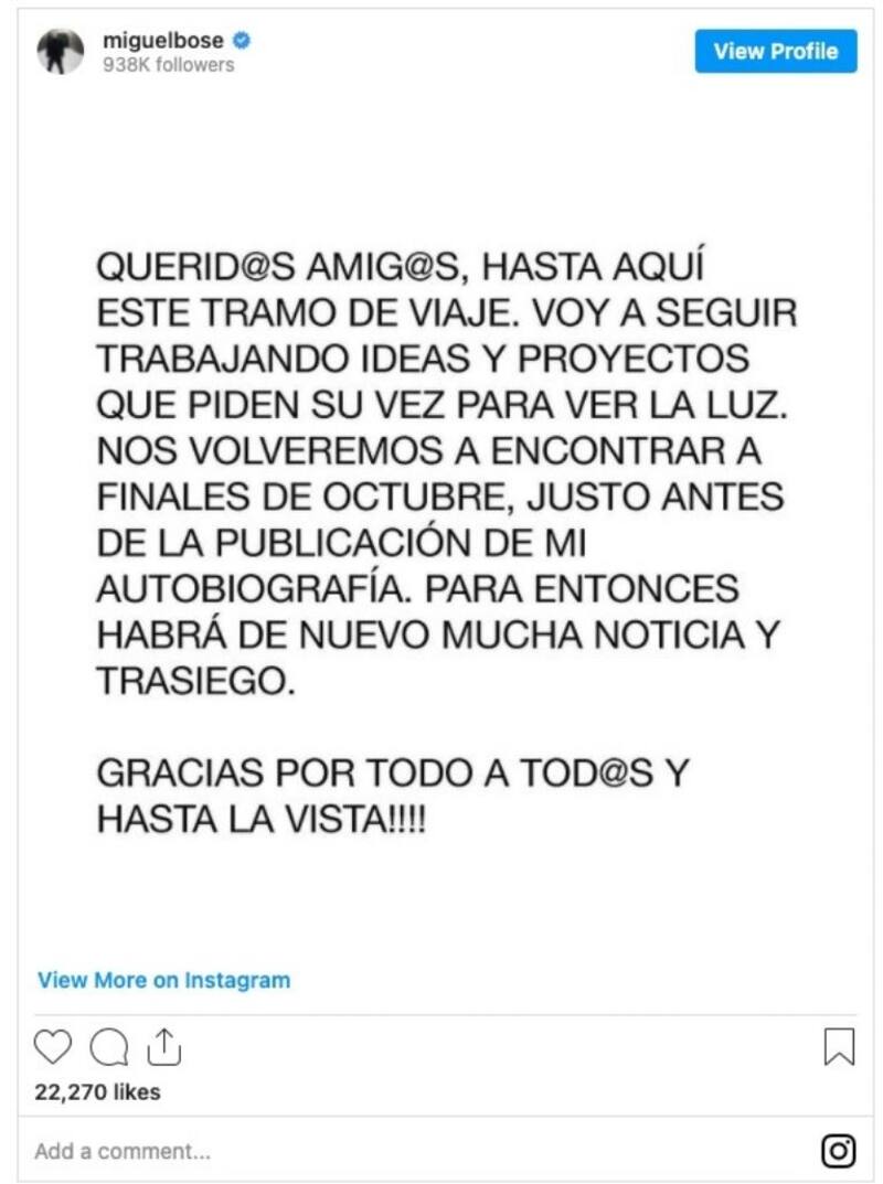 “Nos volveremos a encontrar a finales de octubre justo antes de la publicación de mi autobiografía. Para entonces habrá de nuevo mucha noticia y trasiego. Gracias por todo a todo@s y hasta la vista”, escribió Miguel Bosé en un mensaje de Instagram. Comunicó que hará una pausa para dedicarse a “ideas y proyectos que piden su vez para ver la luz”, por lo que estará ausente hasta octubre.