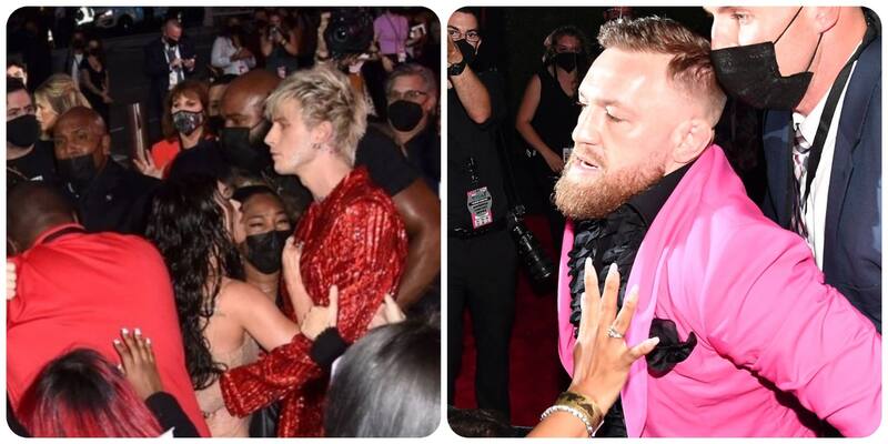 En las imágenes se observa como el irlandés lanzó una bebida al cantante estadounidense Machine Gun Kelly, actual pareja de la actriz Megan Fox, durante la alfombra roja de los MTV VMAs, celebrados esta madrugada en el Brooklyn Barclays Center de Nueva York, y ahí empezó todo.