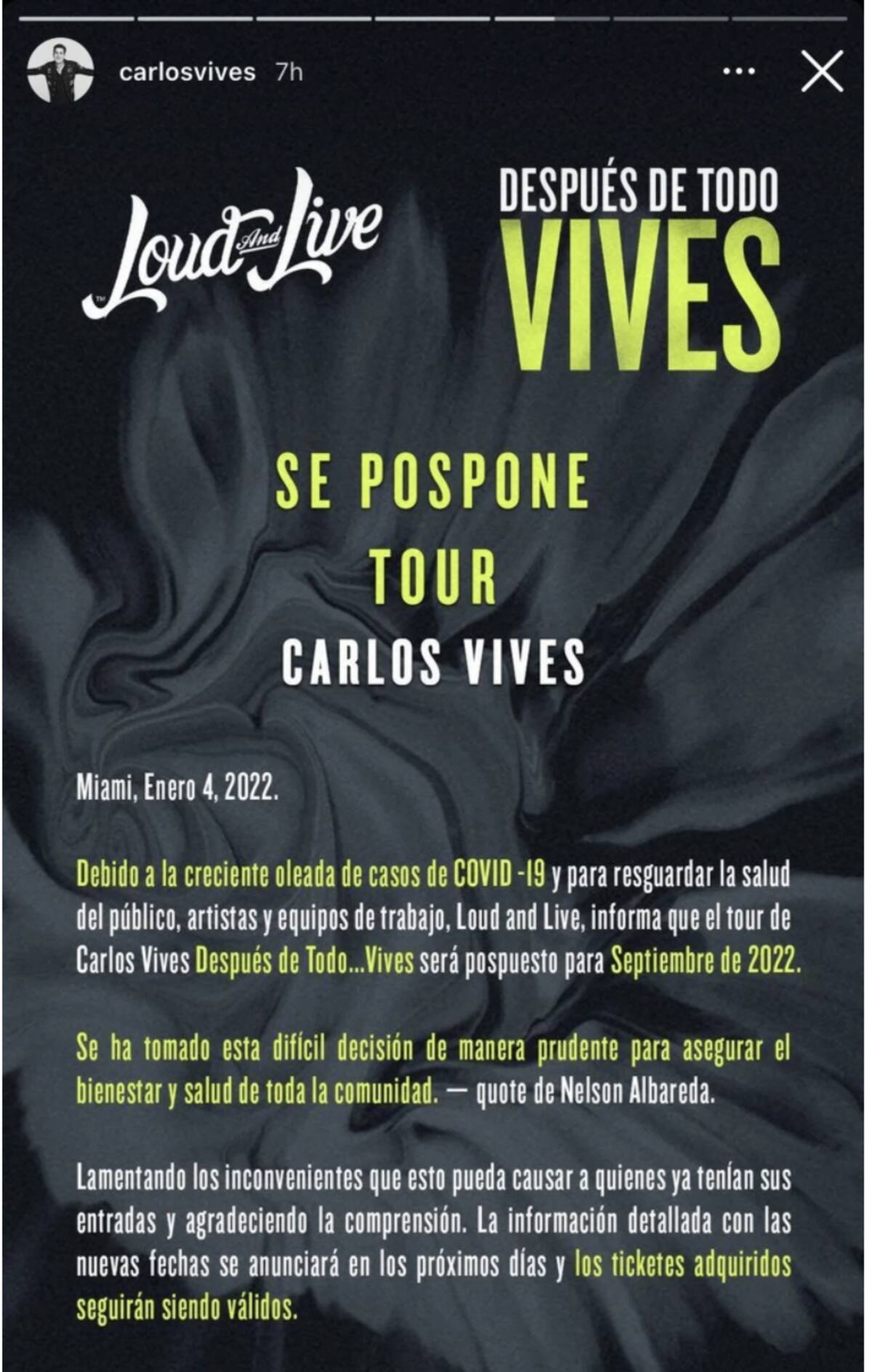 El artista colombiano Carlos Vives decidió suspender y reprogramar su gira al final de 2022 por el aumento de los casos de covid-19. Según Nelson Albareda, fundador y presidente de "Loud and Live", organizador del tour, se tomó "esta difícil decisión de manera prudente para asegurar el bienestar y salud de toda la comunidad".