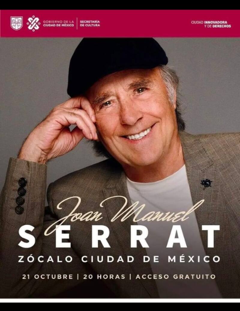 El concierto de "El vicio de cantar" de Joan Manuel Serrar será este 21 de octubre a las 20 horas en el Zócalo de la Ciudad de México, la plaza pública más representativa del país.