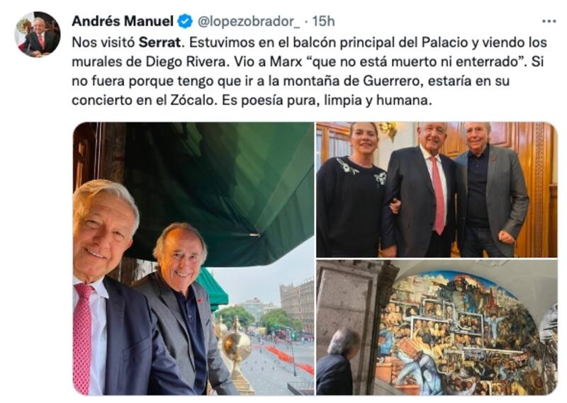 El presidente de México, Andrés Manuel López Obrador, subió a su cuenta de Twitter una galería de fotos en compañía de Serrat en la que escribió: "Nos visitó Serrat. Estuvimos en el balcón principal del Palacio y viendo los murales de Diego Rivera. Vio a Marx "que no está muerto ni enterrado". Si no fuera porque tengo que ir a la montaña de Guerrero, estaría en su concierto en el Zócalo. Es poesía pura, limpia y humana".