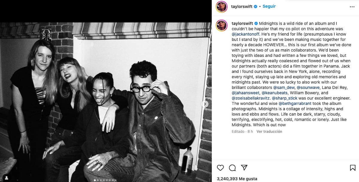 "'Midnights' es un álbum salvaje y no podría estar más feliz de que mi copiloto en esta aventura fuera @jackantonoff. Es mi amigo de por vida (presuntuoso, lo sé, pero lo mantengo) y hemos estado haciendo música juntos durante casi una década. SIN EMBARGO... este es nuestro primer álbum que hemos hecho con solo nosotros dos como colaboradores principales", escribió Taylor en su Instagram.