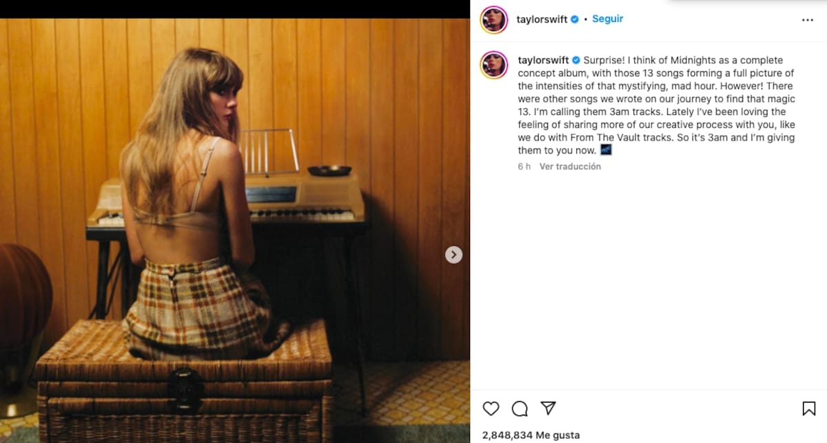 A las tres de la mañana, Taylor hizo un nuevo posteo: "¡Sorpresa! Pienso en 'Midnights' como un álbum conceptual completo, con esas 13 canciones formando una imagen completa de las intensidades de esa hora desconcertante y loca. ¡Sin embargo hubo otras canciones que escribimos en nuestro viaje para encontrar ese mágico 13! Las llamo pistas de 3am. Últimamente me ha encantado la sensación de compartir más de nuestro proceso creativo contigo, como lo hacemos con las pistas de From The Vault. Así que son las 3 am y te las estoy dando ahora".