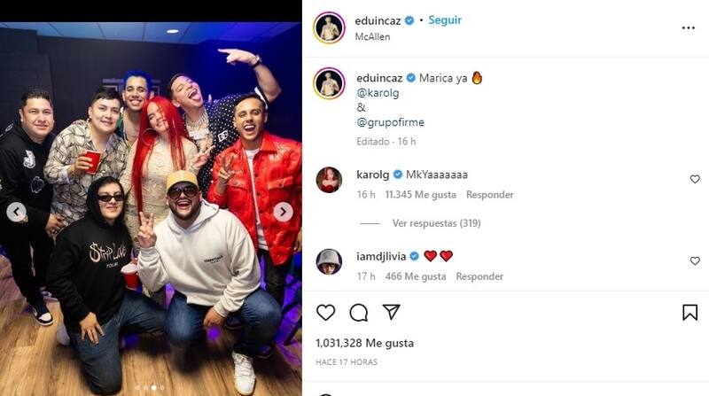 A su vez, tanto la voz de Grupo Firme como su hermano, Jhonny Caz, compartieron fotos del show y de Karol G compartiendo con la banda mexicana en camarines. "Marica ya", escribió Eduin Caz.
