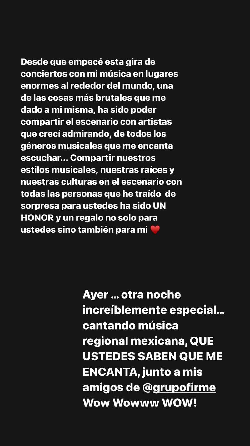Un encuentro que fue muy especial para Karol G, quien en su cuenta de Instagram compartió un especial mensaje, tras su show. "Desde que empecé esta gira de conciertos con mi música en lugares enormes al rededor del mundo, una de las cosas más brutales que me dado a mí misma, ha sido poder compartir escenario con artistas que crecí admirando, de todos los géneros musicales que me encanta escuchar.", comenzó escribiendo.