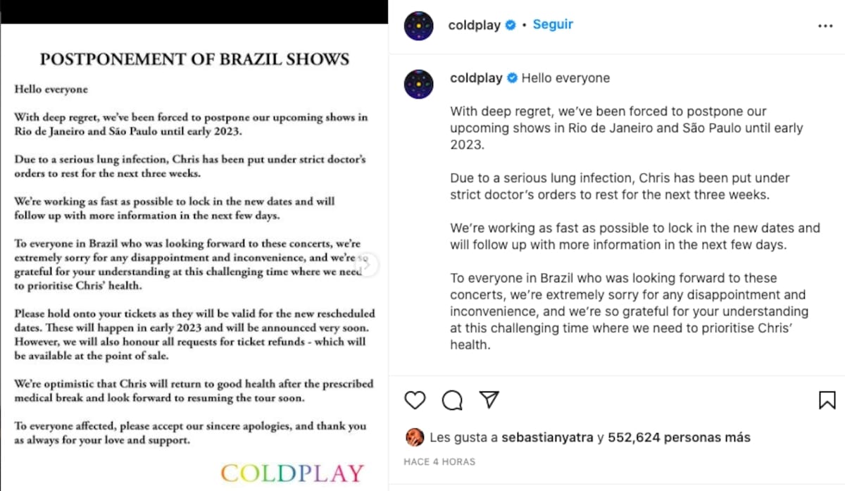 Coldplay subió a su cuenta oficial de Instagram un comunicado para anunciar que cancela sus presentaciones en Brasil debido a que Chris Martin, frontman de la banda, deberá mantener reposo luego de ser diagnosticado con "una infección pulmonar grave".
