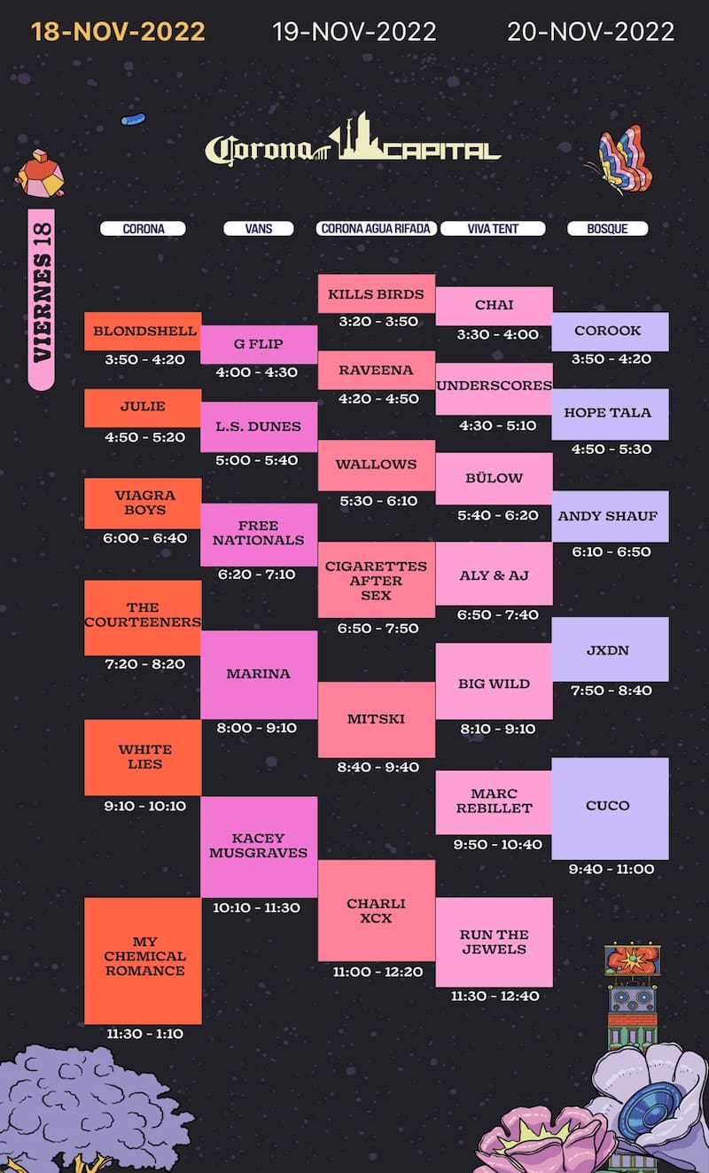 El viernes 18 el festival iniciará a las 3:20 pm con la presentación de Kills Birds en el escenario Corona Agua Rifada, show que inaugurará la edición 2022, y concluirá con el regreso a México de My Chemical Romance, headliner del primer día, programado para tocar entre las 11:30 pm y la 1:10 am en el escenario Corona.