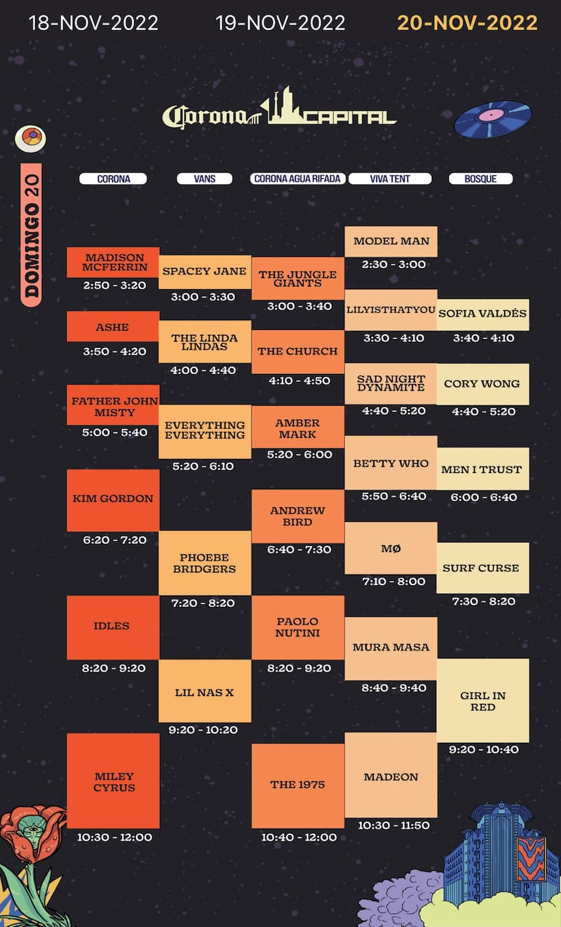 El domingo 20 las actividades arrancarán a las 2:30 pm con Model Man en el Viva Tent. Miley Cyrus cerrará el tercer día, y la edición 2022 del Corona Capital, con su concierto programado entre 10:30 pm y 12 am en el escenario Corona. Si querías oír a Lil Nas X y a Girl in Red, pues tendrás que elegir, dado que ambos shows coinciden en la hora de inicio, a las 9:20 pm, solo que el primero en el escenario Vans y el segundo, en el Bosque.