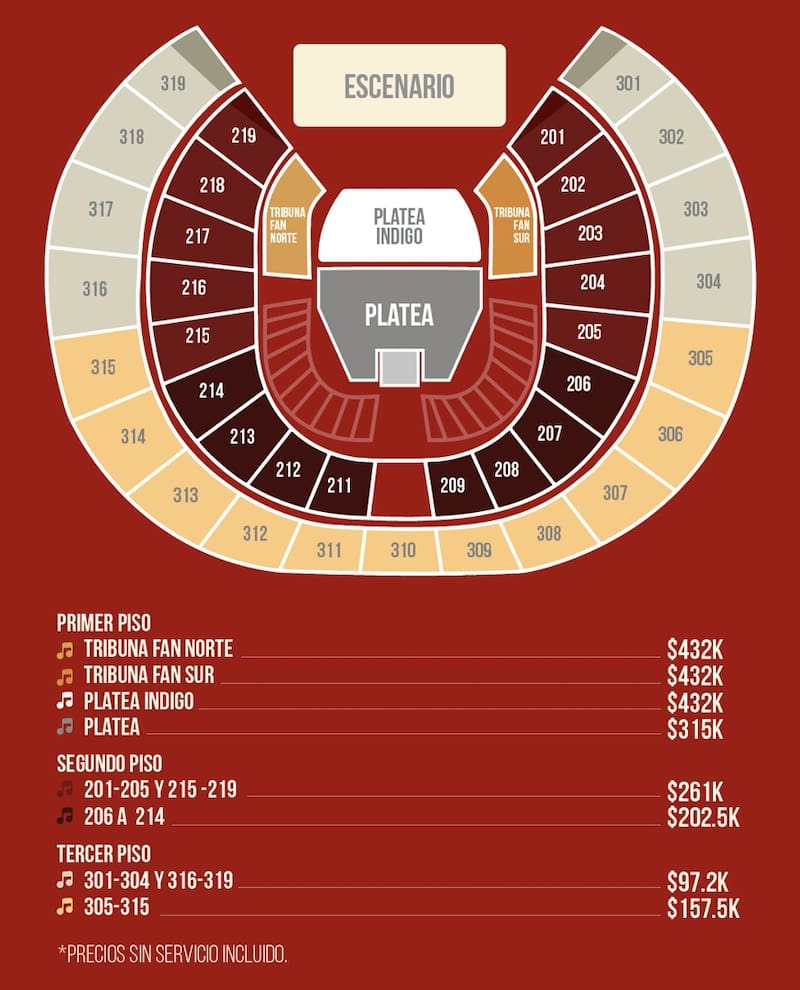 El primer concierto en Bogotá está vendido en su totalidad y solo hay espacio para compra en la segunda fecha, el 7 de diciembre, con boletas desde 150 mil pesos hasta 432 mil pesos colombianos. Para adquirirlas haz clic aquí.