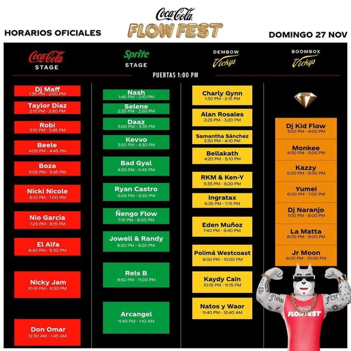 J Balvin es el headliner del primer día del festival. Su concierto está programado de las 12:10 a la 1:25 horas ya del día siguiente en el Coca Cola Stage. Anuel AA, por su parte, cerrará el Sprite Stage en un show programado de las 12:50 a la 1:50 horas también en las primeras horas del domingo.