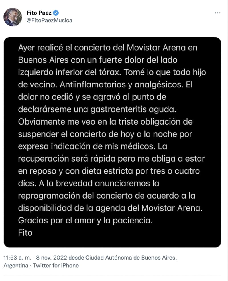 Fito Páez agregó que "obviamente me veo en la triste obligación de suspender el concierto de hoy a la noche por expresa indicación de mis médicos".