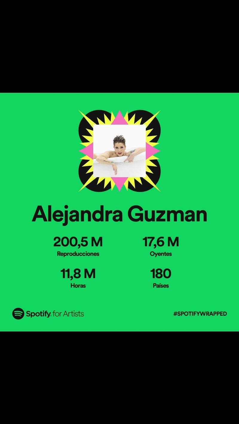 Por su parte, Alejandra Guzmán registró 200.5 millones de streamings producto de 17.6 millones de oyentes. La suma de horas registradas por la plataforma es de 11.8 millones y se escuchó en 180 países.