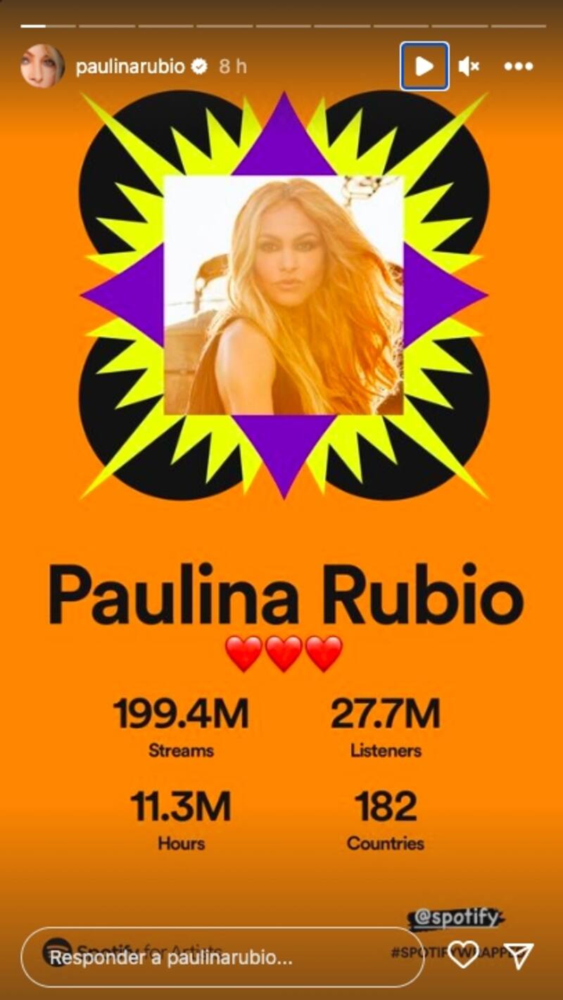 Paulina tuvo 199.4 millones de streamings y 27.7 millones de oyentes. Además, su música fue escuchada durante 11.3 millones de horas en 182 países.