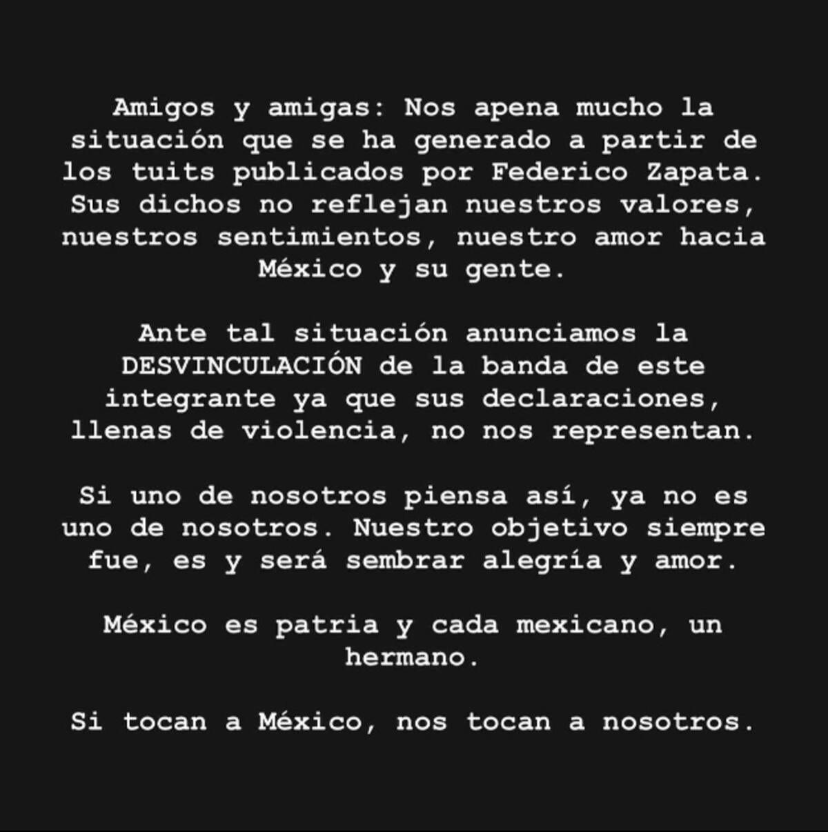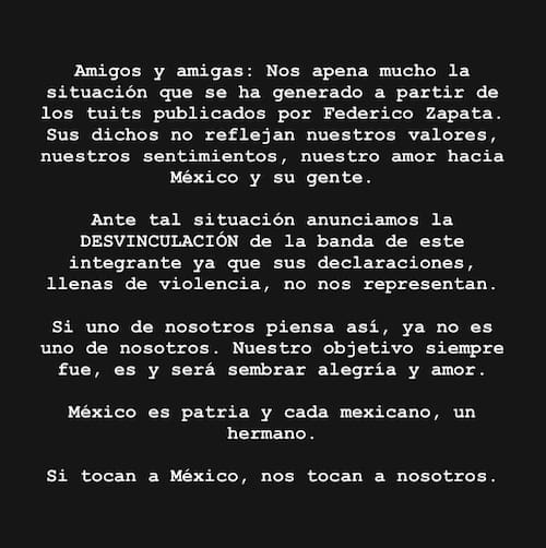 "Amigos y amigas: nos apena mucho la situación que se ha generado a partir de los tuis publicados por Federico Zapata. Sus dichos no reflejan nuestros valores, nuestros sentimientos, nuestro amor hacia México y su gente. Ante tal situación anunciamos la desvinculación de la banda de este integrante ya que sus declaraciones llenas de violencia no nos representan", iniciaron.