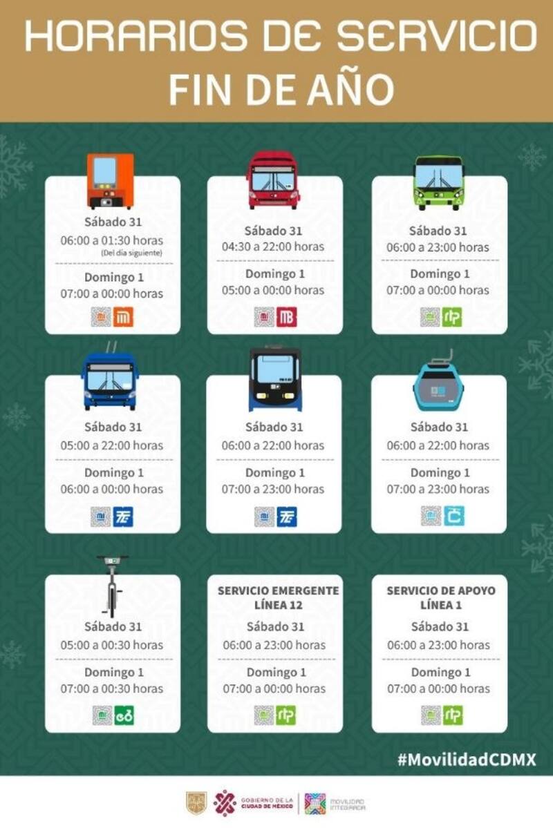 Con el fin de que la población disfrute al máximo de estas festividades, la Secretaría de Movilidad (SEMOVI) informó en un comunicado que el Sistema de Transporte Colectivo Metro y la Línea 1 del Metrobús ampliarán su horario de servicio hasta las 01:30 horas del domingo 1 de enero del 2023.