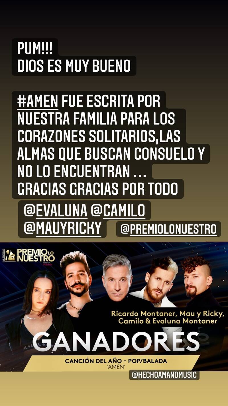 Por ello, tras quedarse con la categoría Canción Del Año Pop, Ricardo Montaner no dudó en usar sus redes sociales para festejar y agradecer el logro. "Pum! Dios es muy bueno", se puede leer en un historia del cantante, quien agregó: "Amen fue escrita por nuestra familia para los corazones solitarios, las almas que buscan consuelo y no lo encuentran... Gracias por todo".