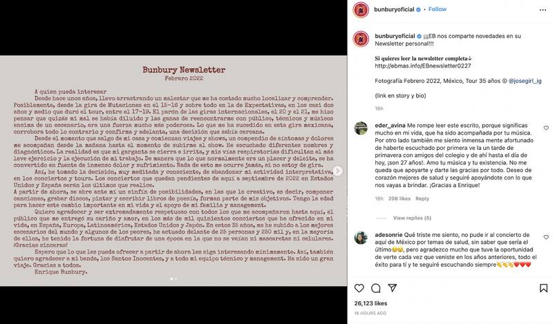 A continuación el comunicado de despedida de los escenarios de Enrique Bunbury