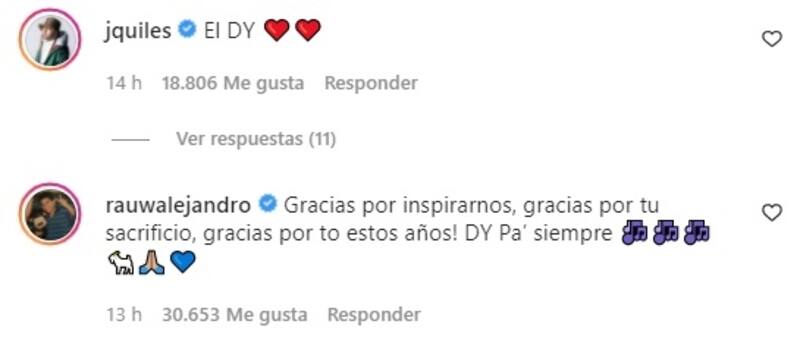 En la publicación que compartió el puertorriqueño, varios artistas se pronunciaron y mostraron su agradecimiento y admiración, como sus compatriotas Rauw Alejandro, "gracias por inspirarnos, gracias por tu sacrificio, gracias por todos estos años! DY Pa' siempre" y Justin Quiles, "el mejor. El DY".