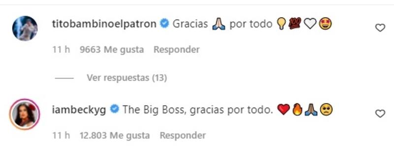 "GRACIAS, GRACIAS, GRACIAS", comentó J Balvin, mientras que Tito El Bambino escribió "Gracias por todo". Las cantantes femeninas Becky G y Natti Natasha también demostraron su aprecio, "the Big Boss, gracias por todo" y "Legend. Gracias por todo".