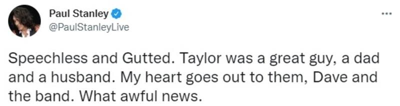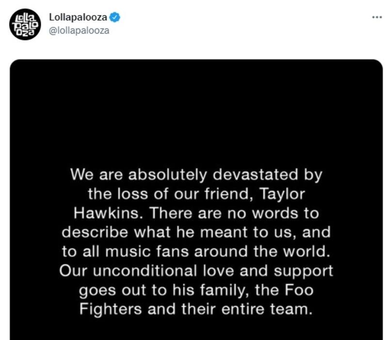 "Extrañado por siempre", escribió la banda liderada por Axel Rose. "Sorprendido y entristecido al escuchar que @taylorhawkins ha fallecido hoy! Nuestras oraciones y condolencias están con la familia Hawkins, @foofighters, amigos y fans. Triste", fueron las palabas del músico de Kiss. Mientras que Ringo Starr pidió que "Dios bendiga a Taylor. Paz y amor para toda su familia y la banda. Paz y amor".