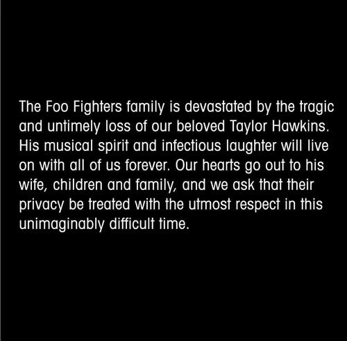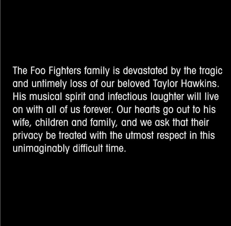 "La familia está devastada por la trágica y prematura pérdida de nuestro amado baterista, Taylor Hawkins", indicó la banda, liderada por Dave Grohl, en sus cuentas de redes sociales. Hawkins, de 50 años, ingresó a la banda en 1997.