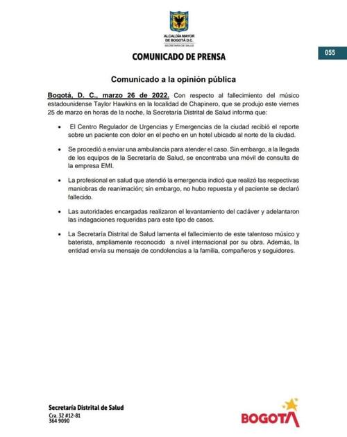 La banda de rock, liderada por Dave Grohl, se encontraba en Bogotá porque se presentarían en el Festival Picnic Stereo. Sin embargo, horas antes de subir al escenario, comunicaron a través de redes sociales que Taylor Hawkins había muerto.