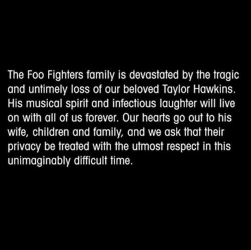 "La familia Foo Fighters está devastada por la trágica y prematura pérdida de nuestra querido Taylor Hawkins. Su espíritu musical y su risa contagiosa vivirán con todos nosotros para siempre", escribieron.