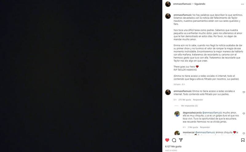 La noche de ayer, aún sin saber nada de su muerte, Emma Sofía realizó su primer tributo en memoria a Taylor Hawkins, ya que interpretó uno de los éxitos de Foo Fighters en un club y lo compartió en su cuenta oficial de Instagram.