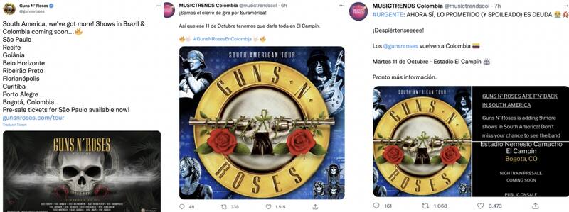 "No te pierdas la oportunidad de ver a la banda en vivo en Brasil y Colombia en el otoño de 2022", informan en la página oficial del grupo integrado por Axl Rose, Slash, Duff McKagan, Dizzy Reed, Richard Fortus, Frank Ferrer y Melissa Reese.