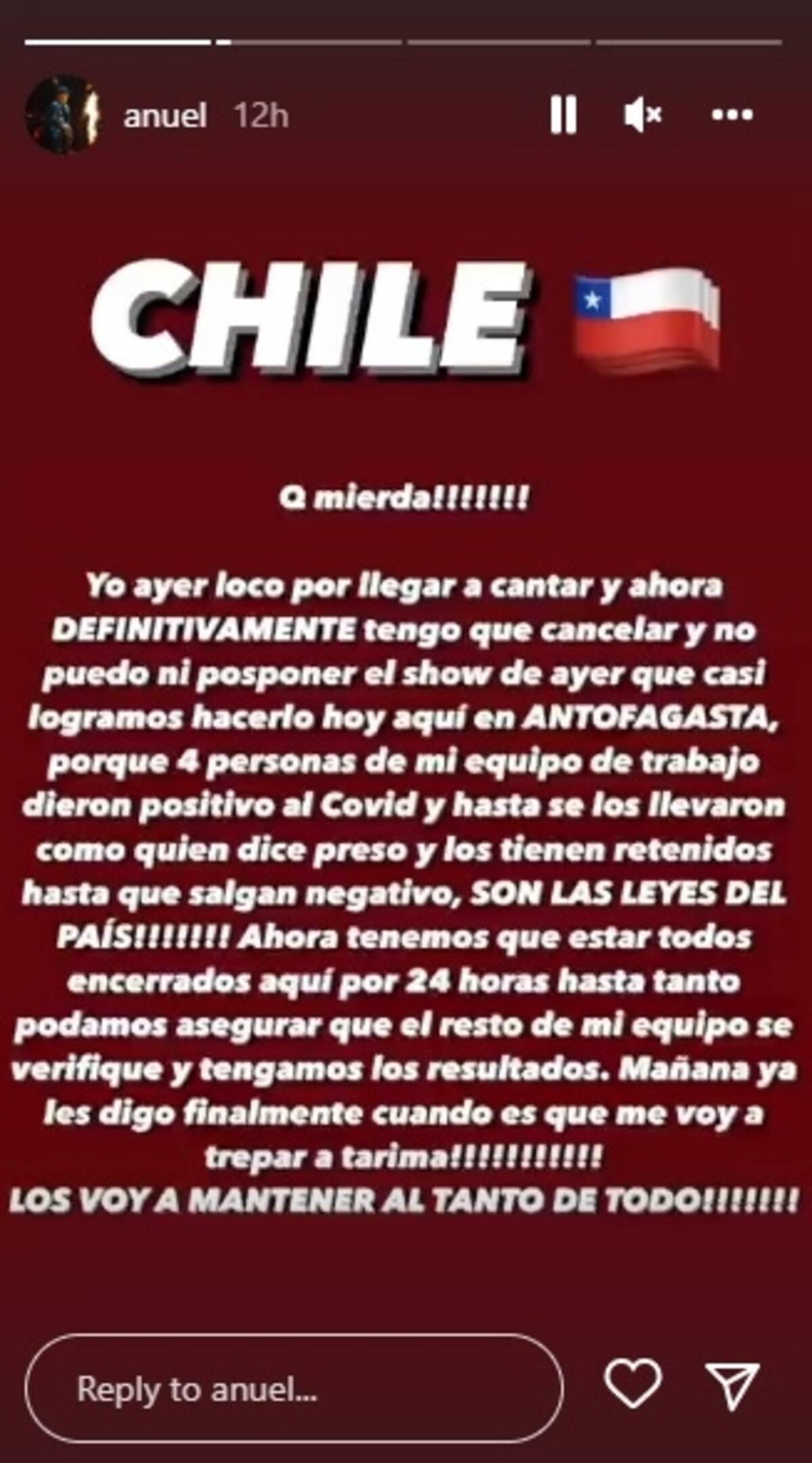 Fue Anuel AA quien dio más detalles, contando que parte de su equipo está contagiado con Covid, por lo que, según las políticas sanitarias de Chile, deben cumplir cuarentena. "Cuatro personas de mi equipo de trabajo dieron positivo al Covid y hasta se los llevaron como quien dice preso y los tienen retenidos hasta que salgan negativo, son las leyes del país", escribió, para luego contar que debe mantener cuarentena por 24 horas.