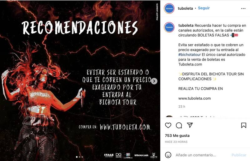 Estos serán conciertos de grandes magnitudes por lo que la empresa que emite la boletería, llamada Tu Boleta, alertó a los seguidores de Karol G que no compraran las entradas en canales no autorizados: "Hemos visto en la calle boletas falsas que están siendo vendidas con el único fin de estafar al público", aseguró la entidad.