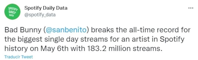 Tanto así, que Bad Bunny rompió el récord de todos los tiempos de streams en un solo día para un artista en la historia de Spotify el 6 de mayo. El viernes pasado, Benito Martínez Ocasio registró con 183,2 millones de transmisiones.