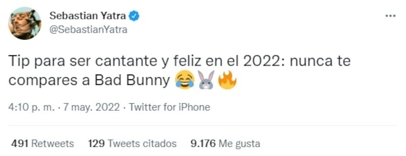 Con el dominio de Bad Bunny en las plataformas de streaming, a su colegas latinos solo les queda felicitar y reír por el logro del puertorriqueño con "Un verano sin ti". Es el caso de Sebastián Yatra.