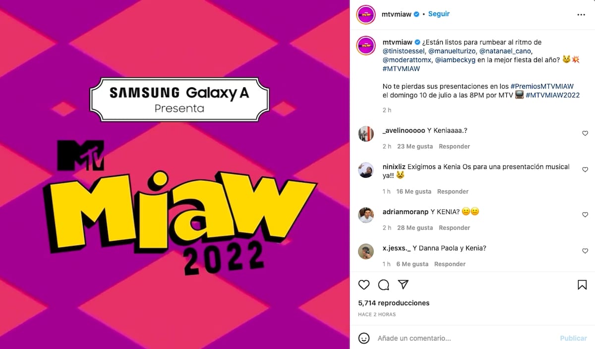 Natanael Cano, TINI, Moderatto y Manuel Turizo, además de la anfitriona del show Becky G, quien fue previamente anunciada como la conductora junto con Jimena Jiménez, serán los encargados de las presentaciones en vivo de los MTV MIAW en su edición 2022.