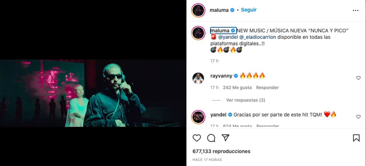 "Nunca y pico" tiene un extra que lo acompaña. Yandel llamó a dos colaboradores: el cantante colombiano Maluma y el rapero boricua Eladio Carrión (en el video se presentan como Yandy, Malu y Ely Carrión).