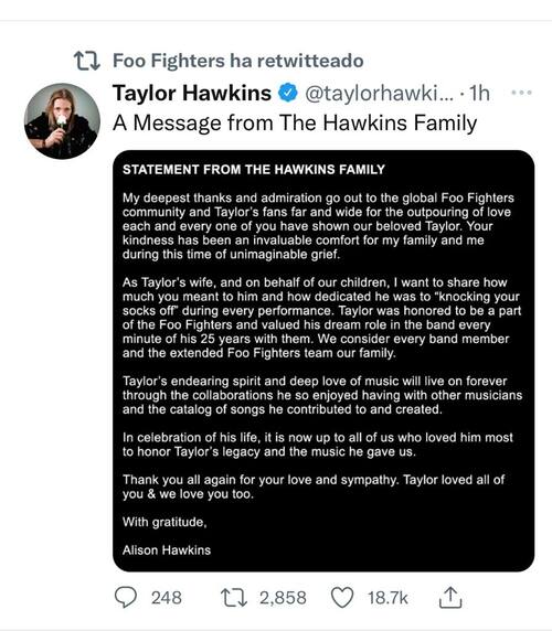 Mientras, la viuda de Taylor, Alison Hawkins agradeció el amor y a apoyo al baterista. "Toda mi admiración y agradecimiento a la comunidad global de Foo Fighters y los fanáticos por el amor que cada uno ha mostrado por Taylor. Su amabilidad ha sido un conforte en este tiempo de inimaginable dolor", precisó Alison.