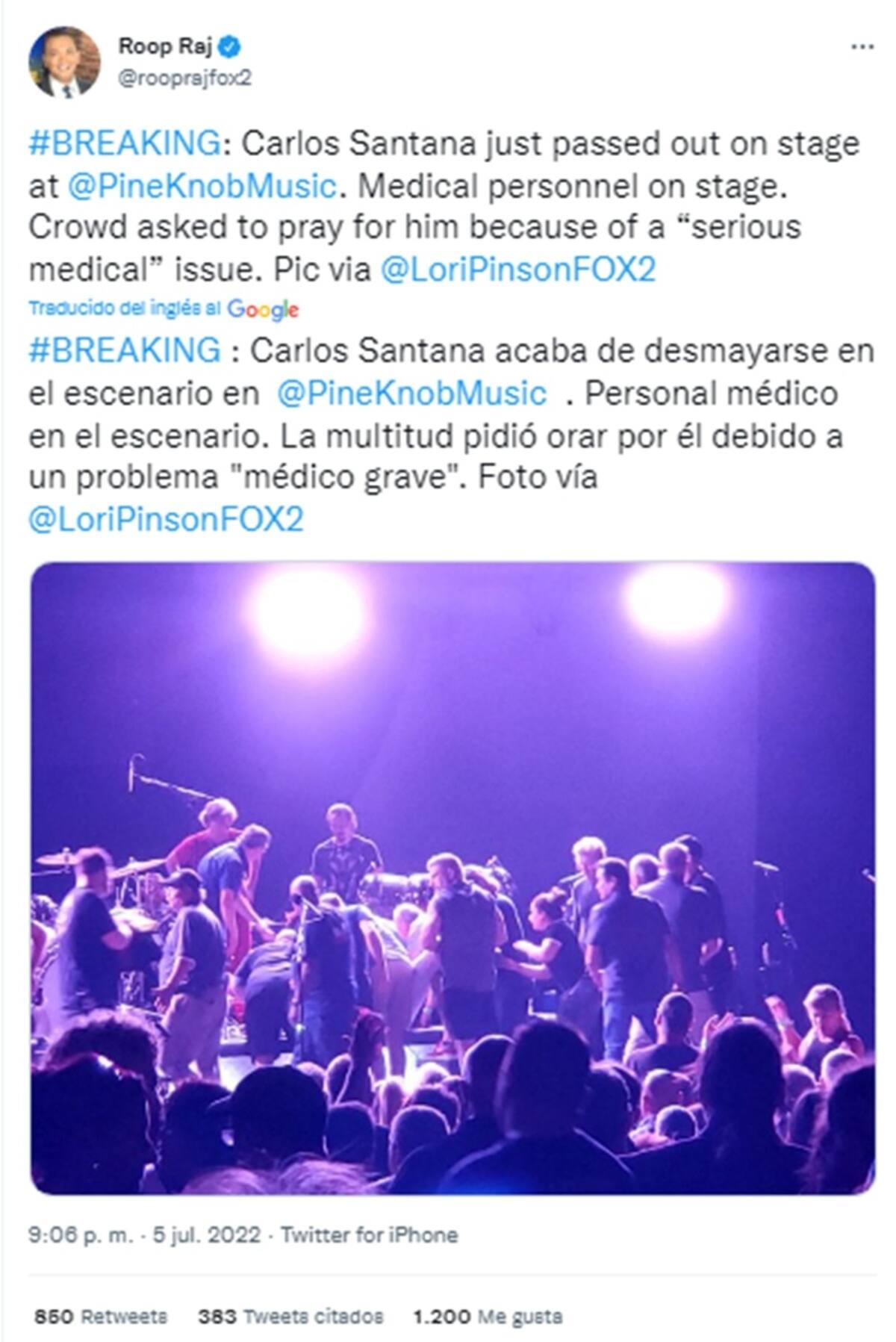Cabe señalar que tras su desvanecimiento Carlos Santana fue trasladado al departamento de emergencias de McLaren Clarkston, donde se reportó que está "bien".