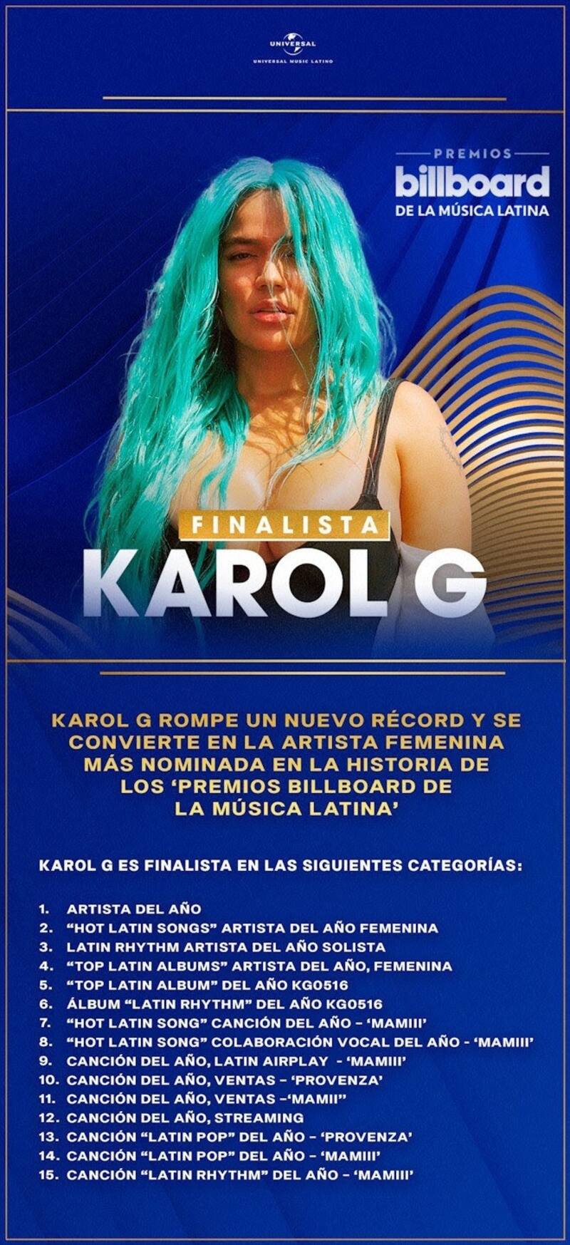 En el tercer lugar de la lista está la cantante paisa Karol G al ser finalista en 15 categorías entre las que incluyen "Artista del año", "Top Latin Album" del Año y Álbum "Latin Rhythm del año" por su incanzable producción KG0516.