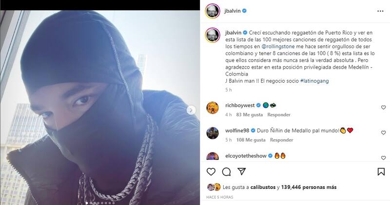 "Crecí escuchando reggaetón de Puerto Rico y ver en esta lista de las 100 mejores canciones de reggaetón de todos los tiempos en @rollingstone me hace sentir orgulloso de ser colombiano y tener 8 canciones de las 100 ( 8 %)", escribió J Balvin.