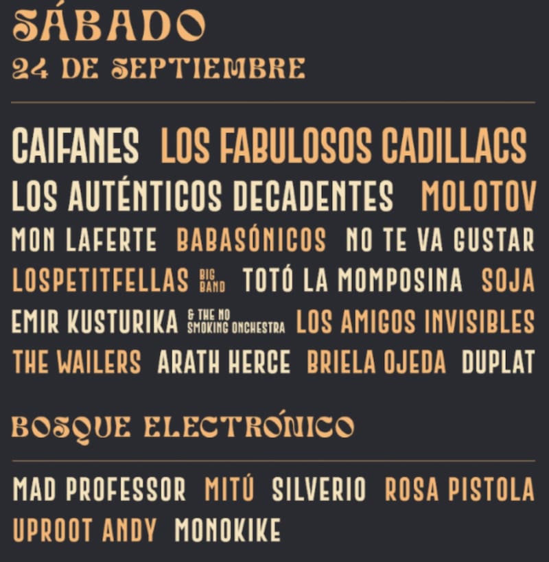 El sábado 24 de septiembre los asistentes podrán disfrutar de grupos como Caifanes y Los Fabulosos Cadillacs. México y Argentina llegarán a mostrar lo mejor de su música con Los Auténticos Decadentes y Molotov.