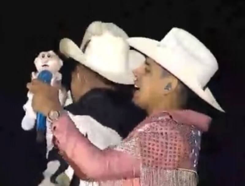 Como no podía faltar, el Dr. Simi hizo su aparición en el concierto de Grupo Firme y fue Eduin Caz quien lo sostuvo para cantar junto a él. Y es que el muñeco de peluche se ha vuelto un clásico regalo que los fans le avientan a los artistas durante sus conciertos.